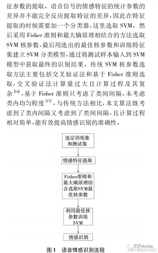 为了提高语音情感识别系统的识别率,研究分析了一种支持向量机核函数参数的优选方法。首先给出影响支持向量机核参数的因素,其次依据这些因素,结合 Fisher 准则和最大熵原理对支持向量机的核参数进行优选。最后用优选参数对基于情感语音数据库进行 5 种情感的识别测试,测试结果表明 Fisher 准则和最大熵方法相融合能够有效地提高语音情感识别准确率。