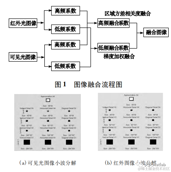由于红外成像仪器本身存在缺陷和环境的影响,造成图像成像效果不是很理想,噪声大,视觉效果不好,这些都会影响融合的效果。所以在图像融合之前先进行图像的去噪、增强等处理,改善红外图像的视觉效果。采用分段函数对红外图像进行增强,提高图像的动态范围,增加图像的对比度,使图像更加清晰明显,以便于进行最后的融合。在图像融合的过程中融合规则往往比较重要,基于像素的融合方法不能反映一定区域内像素之间的关系,而人眼对像素的感知也是区域性的,基于像素的方法往往具有片面性。通过改进的小波算法把红外图像和可见光图像进行分解,分别得到图像的低频系数部分和高频系数部分,低频部分采用梯度求和加权的融合规则,高频部分采用区域相关性方差的融合规则,最后再对低频部分和高频部分进行小波重构得到最后的融合图像。改进的算法融合流程如图 1 所示。经过小波的 4 层分解得到分层图,图 2a 为可见光图像小波分解图示,图 2b 为红外图像小波分解图示,经过逐层分解,得到原图像的不同频段。