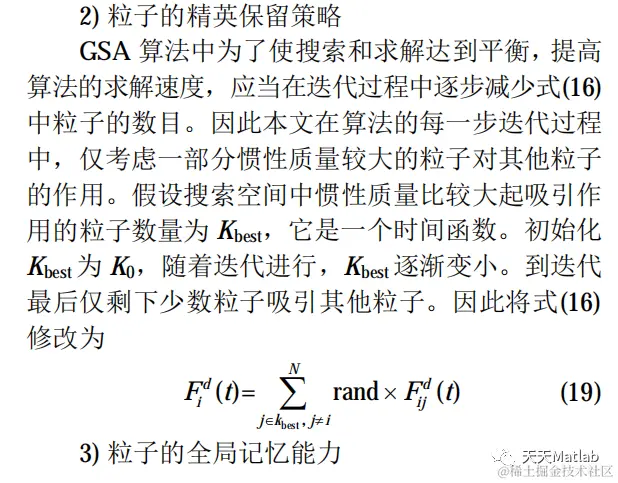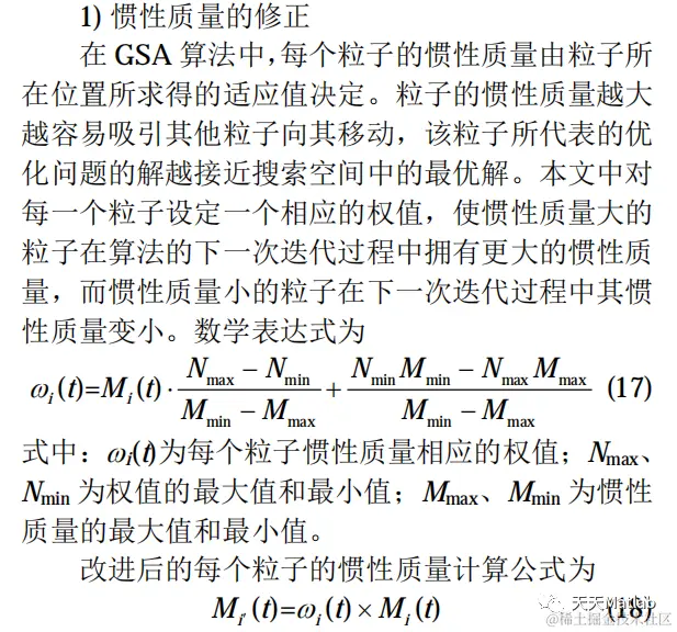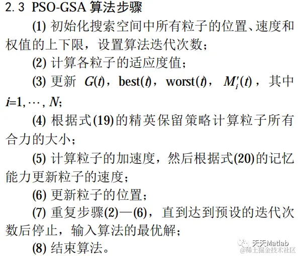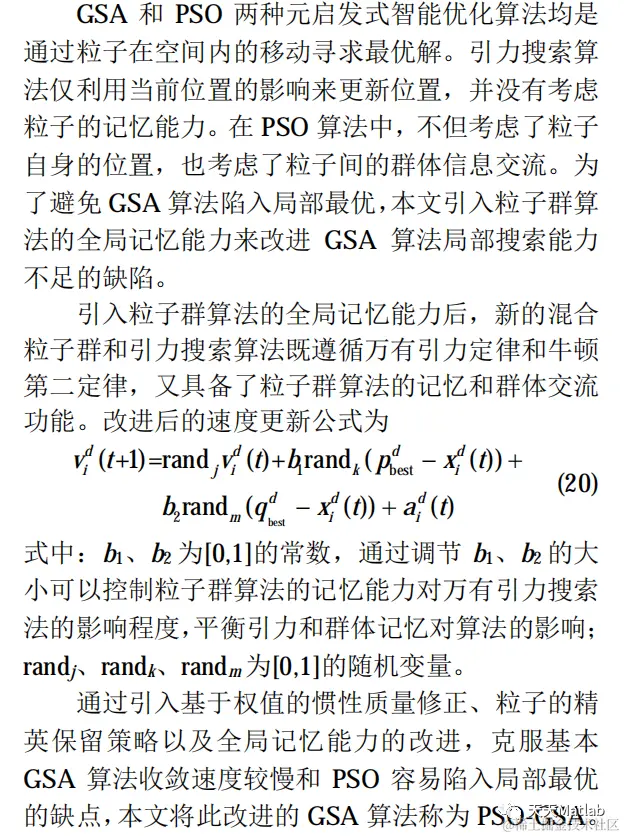 从粒子惯性质量的修正、粒子的精英保留策略以及粒子的全局记忆能力出发,针对 GSA 算法的加速机制和全局搜索策略做相应改进,可得到结合PSO 算法和 GSA 算法优点的 PSO-GSA 算法。