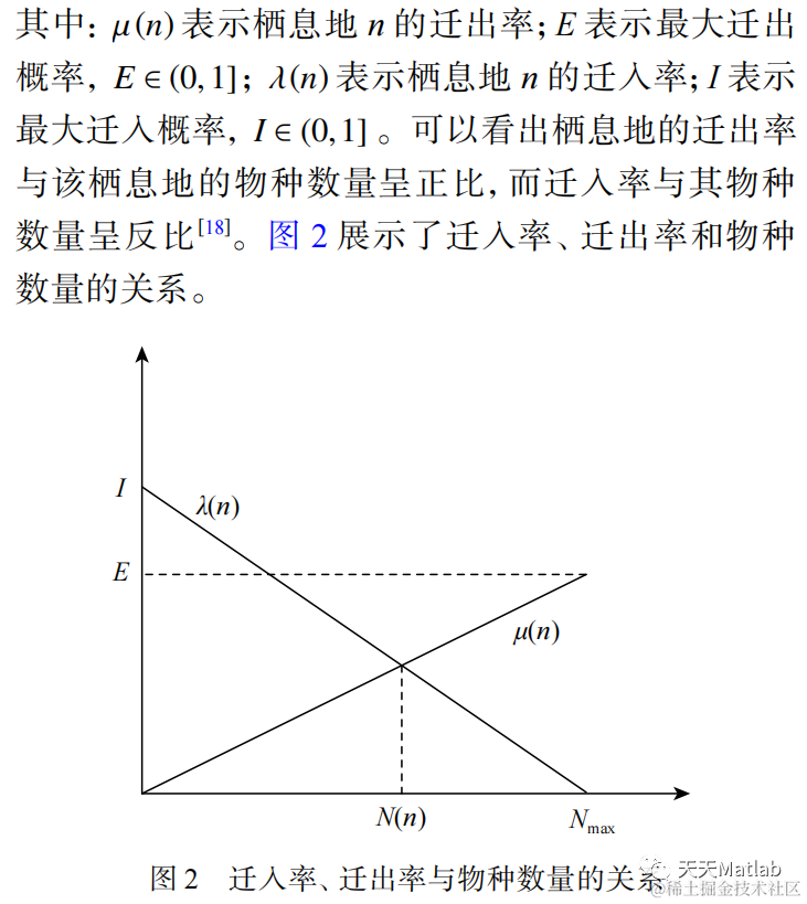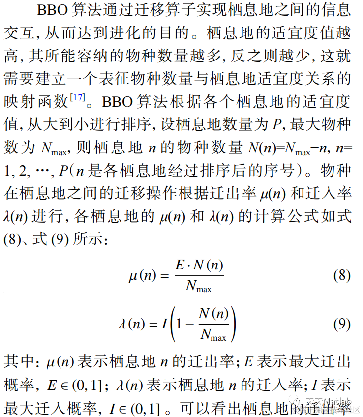 生物地理学优化 (Biogeography-Based Optimization, BBO) 算法自提出以来,因对问题依赖度小、算法参数少、易于实现等优点备受青睐.BBO 算法是一类基于种群和生物启发的群智能优化算法,其核心是栖息地间种群的迁移和变异过程,同时这两个过程也是算法实现优化操作的主要步骤。生物种群分布于不同的栖息地,各栖息地都可用 对 应 的 适 宜 度 指 数 (Habitat Suitability Index,HSI) 来表示。与 HSI 相关的特征包括栖息地的降雨量、植被的多样性和气候等因素,构成了一个描述栖息地适宜度的向量 SIV(Suitable Index Vector)。应用 BBO 算法求解优化问题时,一个栖息地对应优化问题的一个可行解,通过计算各栖息地的适宜度值来评价这些解的优劣程度。根据不同栖息地之间物种的迁移操作和栖息地内物种的变异操作,使适应度值较差的栖息地获得更多适应度值较好的栖息地的信息,实现栖息地的不断进化。