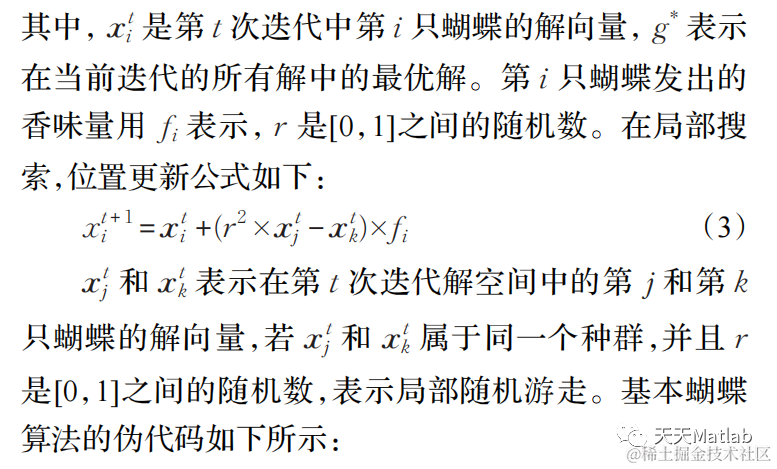 在自然界之中,蝴蝶可以使用它们的各种感官如:嗅觉、视觉、味觉、触觉和听觉去寻找食物和求偶,这些感觉能够帮助它们迁徙、躲避狩猎者以及帮助它们找到合适的地方产卵。在所有的感觉中最重要的是嗅觉,嗅觉能够帮助蝴蝶寻找食物(花蜜),即使在很远的地方也不例外。为了能够找到食物,蝴蝶使用感觉受体用于嗅觉,这些受体分散在蝴蝶的身体部位,如触角、腿和手掌等。这些受体实际上是蝴蝶身体表面的神经细胞,被称为化学感受器。这些化学感受器引导蝴蝶找到最佳的交配伙伴,以便继续强大的遗传系统。雄性蝴蝶能够通过信息素来识别雌性,这是雌性蝴蝶发出的气味分泌物引起特异性反应。蝴蝶会产生一些强度与其适应性相关的香味,即当蝴蝶从一个位置移动到另一个位置时,它的适应性会相应地变化,香味会在远处传播,其他蝴蝶个体能够感知它,这就是蝴蝶个体如何与其他蝴蝶共享个体信息,形成一个群体的社会知识网络。当一只蝴蝶能够闻到来自其他的蝴蝶分泌的香味的时候,它将会朝着香味最浓的方向移动,该阶段在算法中被称为全局搜索。在另一种情况下,当蝴蝶不能从周围感知香味时它将随机移动,这一阶段是局部搜索阶段。针对上述行为,提出如下假设: (1)所有的蝴蝶都应该散发一些香味,使蝴蝶能够相互吸引。 (2)每只蝴蝶都会随机移动或向发出最多香味的蝴蝶移动。 (3)蝴蝶的刺激强度受目标函数的影响或决定。 (4)全局搜索和局部搜索使用切换概率 p 来控制,受到物理接近度以及风、雨、雷、电等各种其他自然因素,局部搜索和全局搜索中的切换概率 p 具有重要意义。