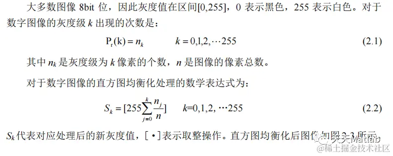 直方图是表达一副图像灰度级分布情况的关于统计信息的灰度级函数。它反映了灰度级与出现这种灰度的概率间的对应关系,其横坐标是灰度级,纵坐标是该灰度级出现的频度。对于高对比度图像的直方图,其灰度级的分布范围宽且较均匀,而对比度低的图像,其直方图分布区间窄且集中于灰度级的某一部分,因此直方图可以表征图像的一些重要特征信息。直方图均衡化处理是空域处理技术的基础。它是通过灰度值的累积函数把原图像的直方图变成均匀分布的直方图,即把相对集中的灰度级分布进行扩展,通过增加像素灰度级分布的动态范围,使对比度得到增加[76],达到增强图像整体对比度的效果。a