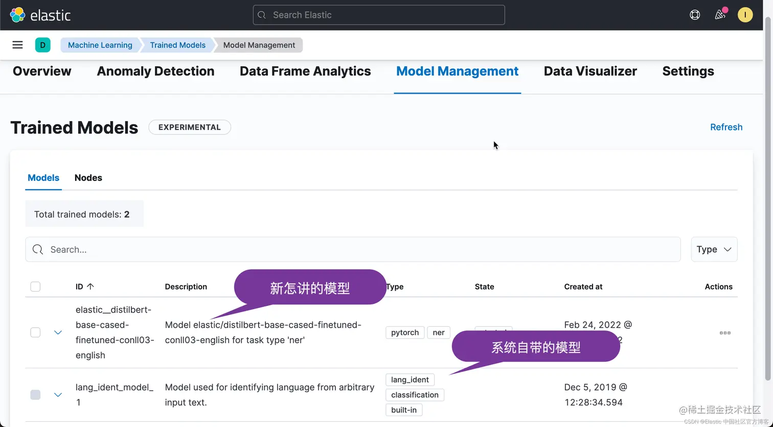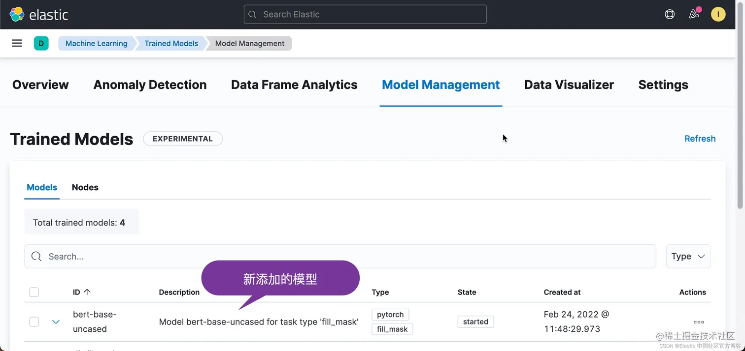 从上面的界面中,我们可以看出一个新怎讲的模型。现在我们已经成功地把模型上传到 Elasticsearch 中。