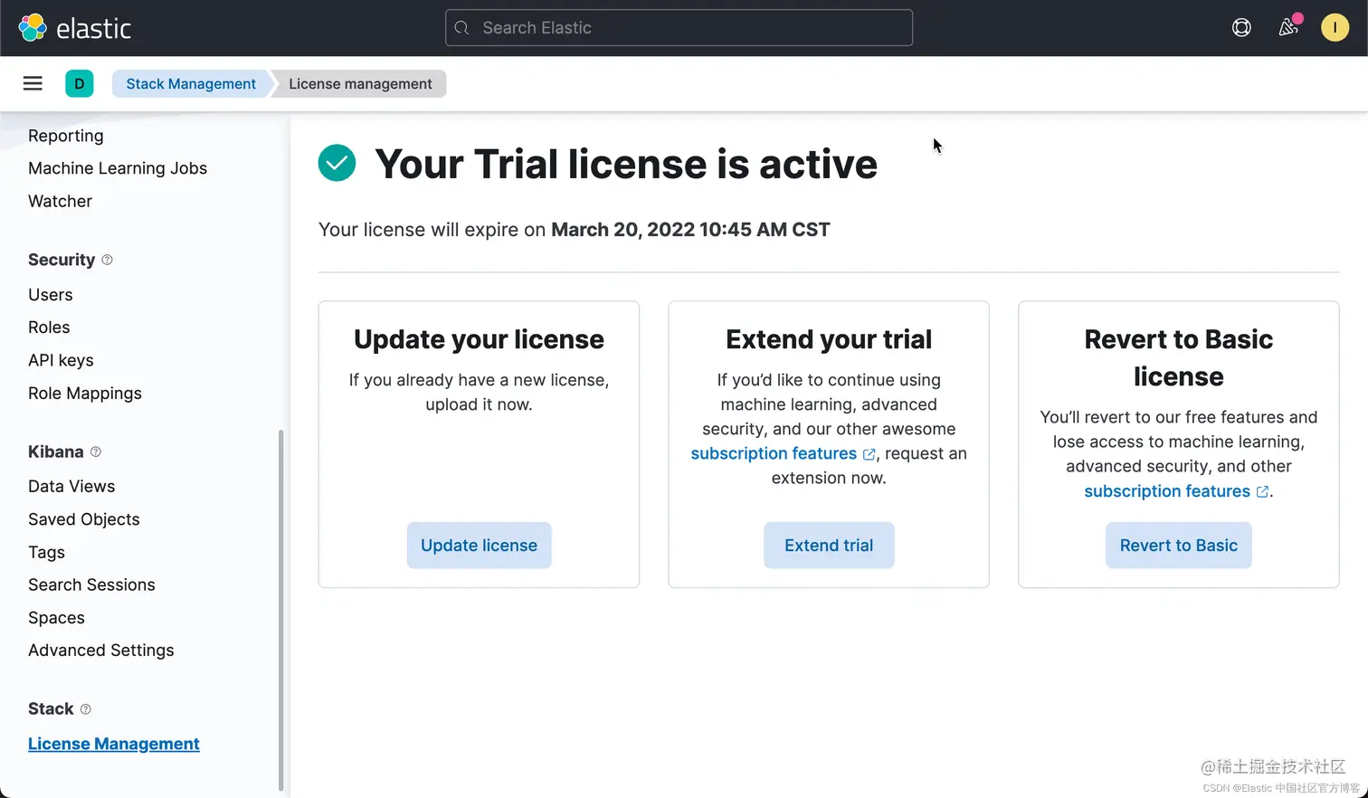 如果你还没有安装好自己的 Elastic Stack 8.0,请参考我之前的文章 “Elastic Stack 8.0 安装 - 保护你的 Elastic Stack 现在比以往任何时候都简单”。在进行下面的操作之前,我们必须启动白金版试用: