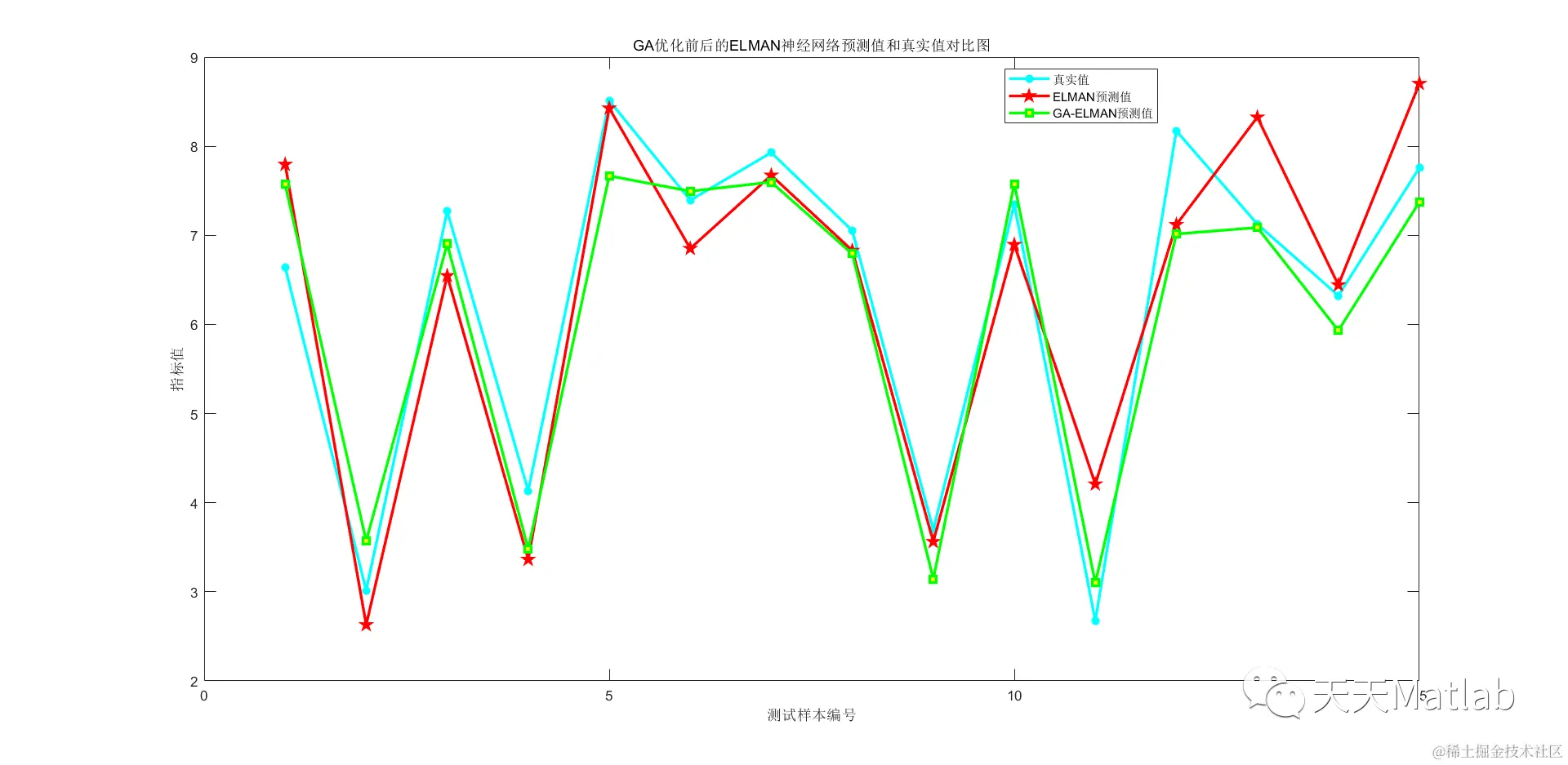 ( 2) 选择适应度函数。为了使 Elman 网络在预测时,预测值与期望值的残差尽可能小,所以选择预测样本的预测值与期望值的误差为目标函数的输出。适应度函数采用 f = 1 / E( t) 选择算子