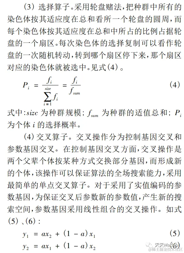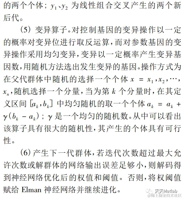 遗传算法是一种具有广泛适用性的搜索方法,通过建立在自然选择和群体遗传学机理基础上的随机迭代、进化,所有的自然种类都是适应环境而得以生存,这一自然适应性是遗传算法的主旋律。遗传算法结合了适者生存和随机信息交换,前者消除了解中不适应因素,后者利用了原有解中已有的知识,从而有力地加快了搜索过程。遗传算法具有多点并行搜索的特点,可以避免陷入局部极值点,同时它在使用时需要的信息较少,且放松了对目标函数值的要求,仅通过复制、交叉和变异运算就可以以很大的概率在解空间中搜索到全局最优或次优解。遗传算法优化 Elman 神经网络时首先确定 El- man 神经网络的拓扑结构,Elman 神经网络的拓扑结构是根据样本的输入/输出参数个数确定的,这样就可以确定遗传算法优化参数的个数,从而确定种群个体的编码长度。然后遗传算法优化的参数是Elman 神经网络的初始权值和阈值,Elman 神经网络的权值和阈值一般是随机初始化的随机数,这个初始化参数对网络训练的影响很大,但是又无法准确获得,对于相同的初始权重值和阈值,网络的训练结构式一样的,引入遗传算法就是为了优化出最佳的初始权值和阈值。使优化后的 Elman 神经网络能够更好的进行样本预测。