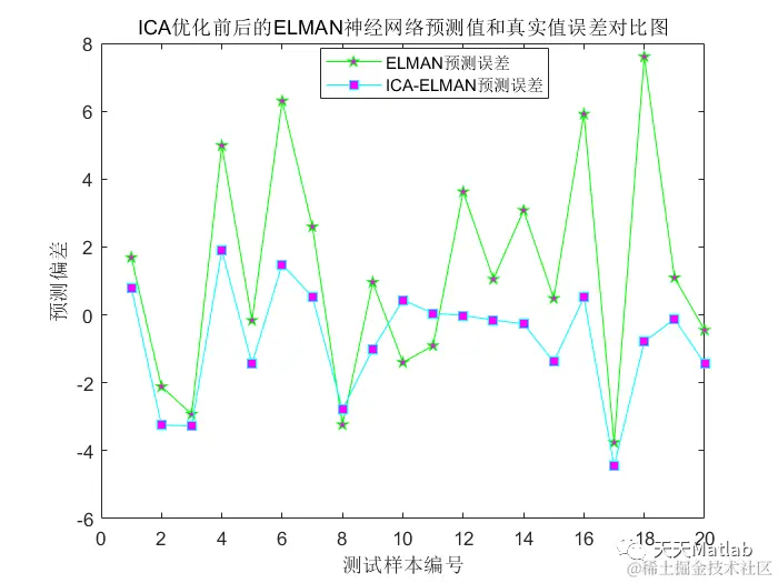 第一步 初始化 Elman 网络所需参数,并新建 Elman 网 络,net=newelm(minmax(input),[11,1],{'tansig','purelin'},'traingdx'),其中 input 是训练集数据,tansig 是隐藏层的激活函数,purelin是输出层激活函数,traingdx是梯度下降函数;