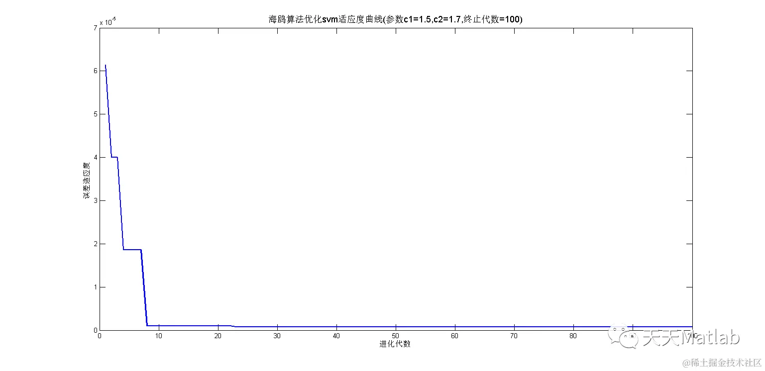 title(['海鸥算法优化svm适应度曲线','(参数c1=',num2str(c1),',c2=',num2str(c2),',终止代数=',num2str(maxgen),')'],'FontSize',13);