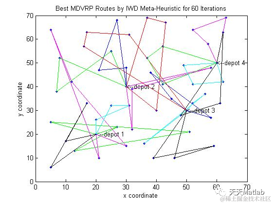 title(['Best MDVRP Routes by IWD Meta-Heuristic for ', num2str(iterations), ' Iterations']);