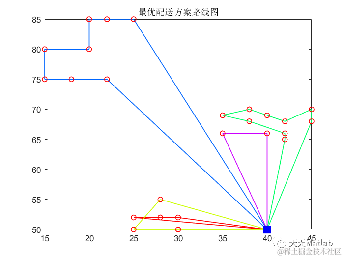 disp(['车辆使用数目:',num2str(bestNV),',车辆行驶总距离:',num2str(bestTD),',违反约束路径数目:',num2str(best_vionum),',违反约束顾客数目:',num2str(best_viocus)]);