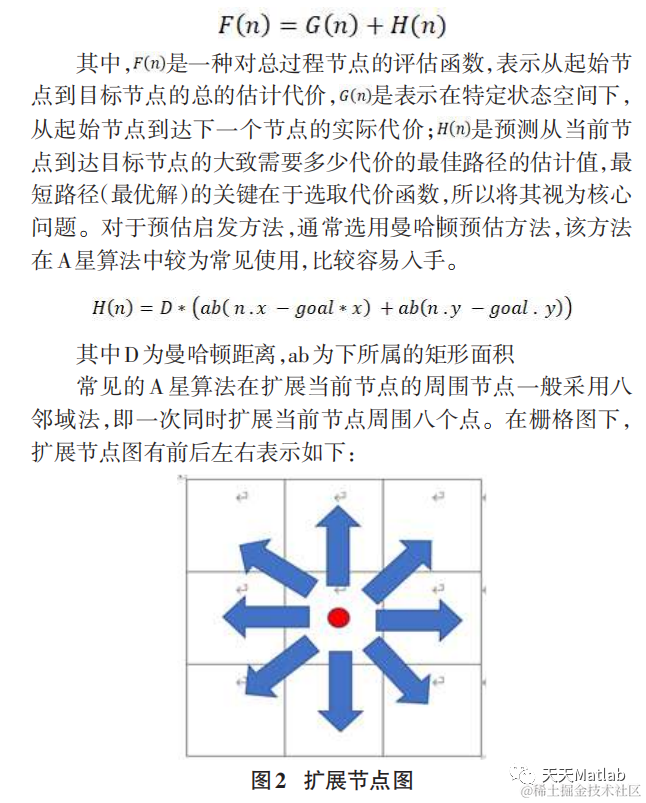A星算法是一种启发性的算法,即由通过设定评估函数,全面性地对网格的各个节点进行评估。而每个节点就是机器人所到达的位置,对每个位置点都进行智能化评估,找到最好的位置,从而最终找到目标位置。A星算法评估函数如下: