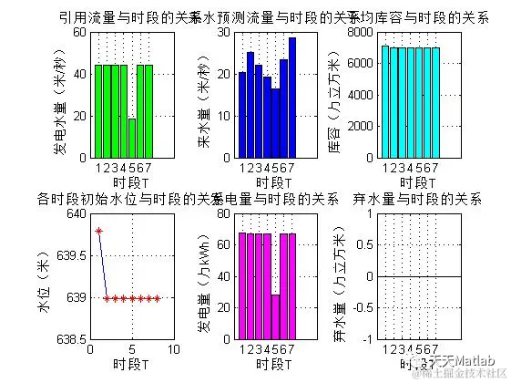 subplot(2,3,6),bar(x,Quit1,'k'),title('弃水量与时段的关系'),xlabel('时段T'),ylabel('弃水量(万立方米)'),grid