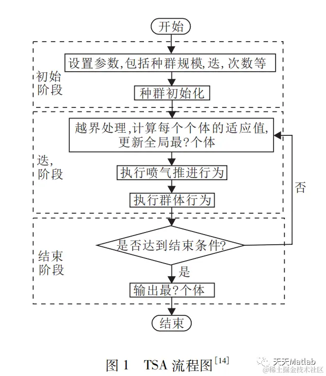 被囊群算法是一种元启发式算法,模拟被囊动物的喷气推进行为和群体行为. 喷气推进行为主 要利用自身的重力、深海中的水流平流、个体之间的相互作用力,实现个体之间搜索冲突避免,同时,也 具有向最优个体移动的能力. 喷气推进行为主要由 3 部分组成: 搜索个体冲突避免,保持接近最佳搜索个体,向最佳个体的位置移动. 群体行为主要为更新搜索个体最优解的位置,通过被囊动物周围的神经感知水流的变化和同伴的发光确定同伴位置,共同向目标食物源位置聚集,达到群体觅食的目的. TSA 采用喷气推进行为和群体行为这两种策略,更真实 地模拟海洋中被囊动物群体觅食行为,达到算法实 现简单、跳出局部最优能力强、寻优精度高的目的. TSA 具体流程如图 1 所示
