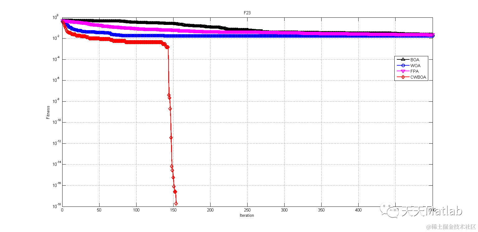<span style="color:#000000">semilogy</span>(<span style="color:#000000">t</span>, <span style="color:#000000">Curve_BOA</span>, <span style="color:#aa1111">'k^-'</span>, <span style="color:#000000">t</span>, <span style="color:#000000">Curve_WOA</span>, <span style="color:#aa1111">'bo-'</span>, <span style="color:#000000">t</span>, <span style="color:#000000">Curve_FPA</span>, <span style="color:#aa1111">'mv-'</span>, <span style="color:#000000">t</span>, <span style="color:#000000">Curve_CWBOA</span>, <span style="color:#aa1111">'rd-'</span>, <span style="color:red">...</span>
