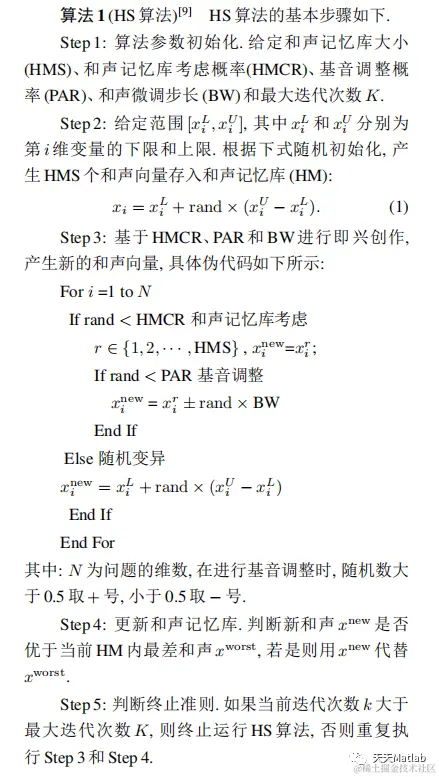 和声搜索算法(Harmony search, HS)是一种新兴的智能优化算法,通过反复调整记忆库中的解变量,使函数值随着迭代次数的增加不断收敛,从而来完成优化。算法概念简单、可调参数少、容易实现。它是 2001 年韩国学者 Geem Z W 等人提出的一种新颖的智能优化算法。