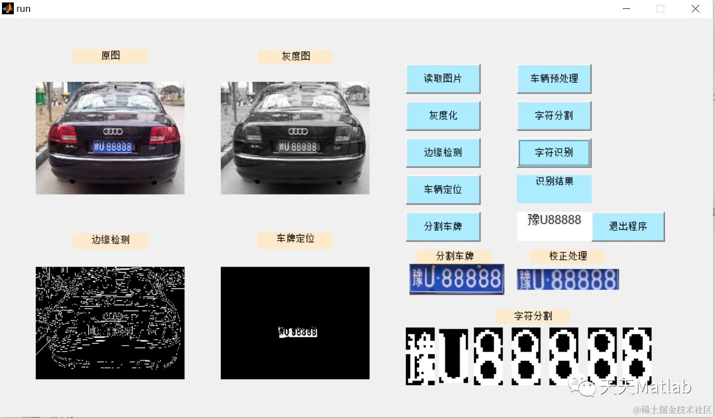随着信息时代的到来,现代智能交通系统能够很轻易的识别出汽车牌照,这是智能交通管理的标志之一。智能交通管理系统的牌照识别集合了图像采集和预处理、车牌定位技术、字符分割和字符识别等相关技术。其中,车牌定位、字符分割和字符识别是最关键的技术,也是本次毕业设计的难点所在。正确利用好这三种关键技术,将有助于牌照识别的实时性和准确性,对于智能交通系统的实现有着决定性作用。在MATLAB软件开发环境下,系统首先对图像进行预处理、然后将预处理后的图像进行定位分割,最后识别出相应牌照上的字符,这样就可以模拟设计出汽车牌照识别系统。本文的图像预处理模块是将图像灰度化和用Canny算子进行边缘检测,汽车牌照定位依据是它的颜色特征,使用MATLAB中的Radon函数和Imrotate函数来进行车牌矫正;分割字符时,需要先找到连续的文字块,然后根据长度大小来确定是否分割,假如所找到的连续文字块的长度大于阈值,那么就表示可以对此文字块进行分割。并且为了能对车牌上的字符进行正确的识别,本文将采用BP神经网络算法。最后设计GUI界面,使界面更加简洁明了,便于操作。根据实验得出的结论,这种方式可以对蓝色的车牌进行高效、精确的识别,同时,也对光照、旋转和噪声表现出很好的鲁棒性,定位精度和识别正确率甚至可以超过90%。