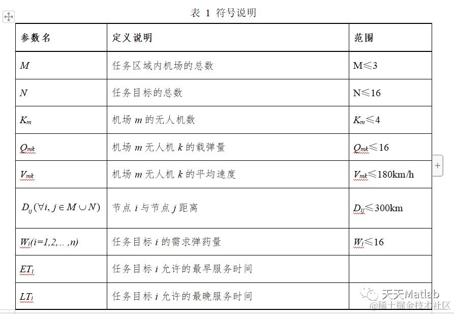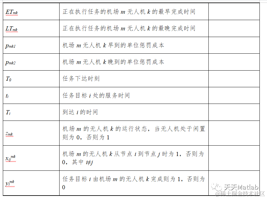 该问题不仅需要确定每个目标应该由哪个机场以及无人机去执行,同时还要确定执行任务的先后顺序,且在不违反各个任务时间窗限制,飞机航程限制、火力威胁、探测威胁等约束条件下满足代价最小化。具体符号如表所示: