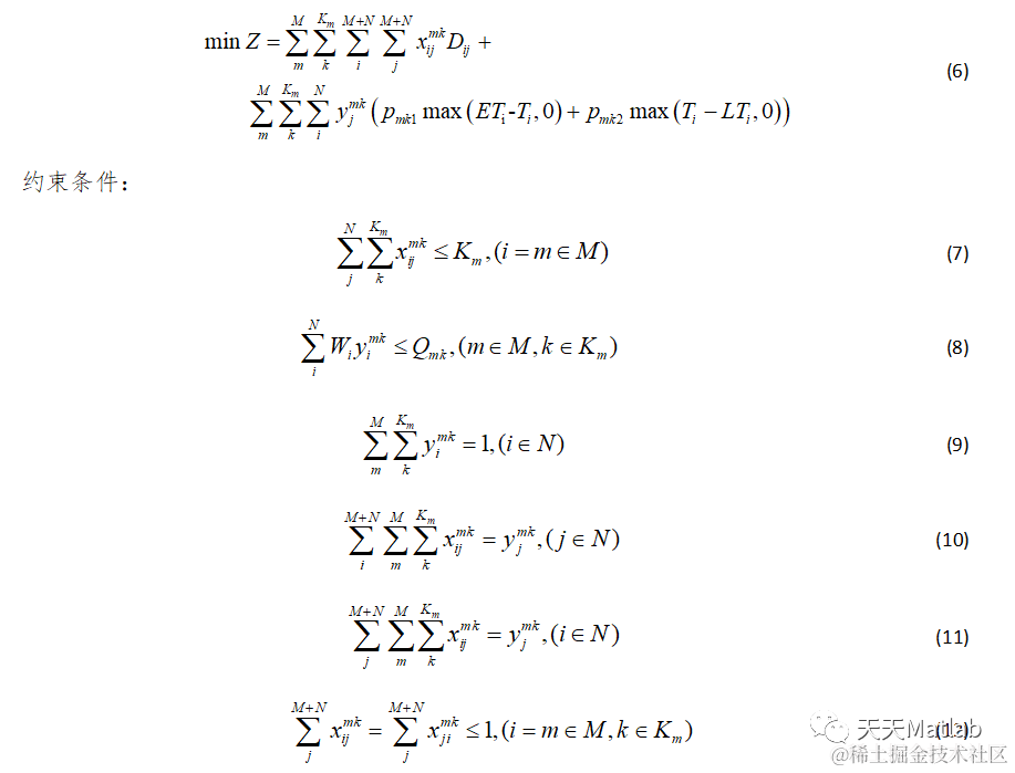 构建数学模型时,同时考虑车辆时间窗和客户软时间窗约束,根据违反客户要求时间的长短施以相应的惩罚,从而在目标函数增加相应的时间成本。因此,带时间窗和任务软时间窗的多车场车辆路径问题的数学模型为: