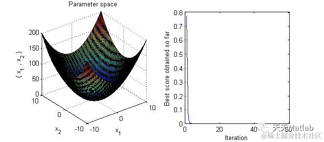 %% Bat Algorithm For Sphere Function %%%% 开始 %%clear;clc;close all;%% 初始化参数 %%Iter=1;%初始迭代次数Iter_Max=50;%最大迭代次数Dim=2;%问题的维度Pop_Size=30;%种群大小Loud_Min=0;%响度最小值Alpha=0.95;%响度控制参数Gama=0.95;%脉冲发射率控制参数Freq_Min=0;Freq_Max=2;%频率范围V_Min=-5;V_Max=5;%速度范围Pop_Min=-10;Pop_Max=10;%种群个体大小范围%% 初始化种群 %%PR=0.5*ones(Pop_Size,1);%脉冲发射率初始化Loud=0.9*ones(Pop_Size,1);%响度初始化PR0=PR;%记录初始脉冲发射率Beta=rand(Pop_Size,1);%随机化Beta值Freq=Freq_Min+(Freq_Max-Freq_Min)*Beta;%频率初始化V=V_Min+(V_Max-V_Min)*rand(Pop_Size,Dim);%速度初始化% V=zeros(Pop_Size,Dim);Pop=Pop_Min+(Pop_Max-Pop_Min)*rand(Pop_Size,Dim);%种群初始化for i=1:Pop_Size Fitness(i)=Sphere_Function(Pop(i,:));%评估当前野草对应的适应度值end[Fitness_Best,Position_Best]=min(Fitness);%寻找当前最优适应度值Position_Current=find(Fitness==Fitness_Best);%最优适应度值的位置Trace(Iter)=Fitness_Best;%记录当前代适应度值最小值 %% 迭代部分 %%while Iter<=Iter_Max Iter%记录当前迭代次数 Fitness_Best%记录当前最优适应度值 for i=1:Pop_Size Beta(i)=rand; Freq(i,:)=Freq_Min+(Freq_Max-Freq_Min)*Beta(i);%频率控制 Trace(Iter)=Fitness_Best;%记录当前代适应度值最小值end%% 数据后处理 %%Iter%记录当前迭代次数Fitness_Best%记录当前最优适应度值figure('Position',[269 240 660 290])%Draw search spacesubplot(1,2,1);X1=linspace(-10,10,101);X2=linspace(-10,10,101);for i=1:length(X1) for j=1:length(X2) Y(i,j)=X1(i)^2+X2(j)^2; endendsubplot(1,2,1),surf(X1,X2,Y);title('Parameter space')xlabel('x_1');ylabel('x_2');zlabel('( x_1 , x_2 )')subplot(1,2,2);,plot(Trace);xlabel('Iteration');ylabel('Best score obtained so far');