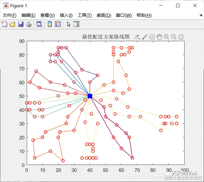 dist=squareform(h); %距离矩阵,满足三角关系,暂用距离表示花费c[i][j]=dist[i][j]