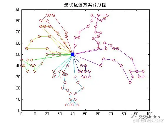 dist=squareform(h); %距离矩阵,满足三角关系,暂用距离表示花费c[i][j]=dist[i][j]
