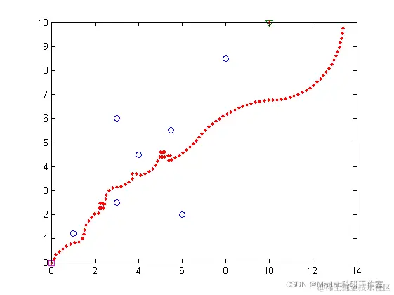 Xsum=[10 10;1 1.5;3 2.2;4 4.5;3 6;6 2.5;5.5 6; 6 4.5;9 9;8.5 5];% 这个向量是(n+1)*2 维,其中[10 10] 是目标位置,剩下的都是障碍的位置。