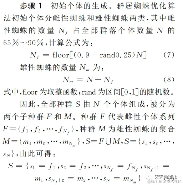 群居蜘蛛优化算法(SSO)是一种新的随机全局优化技术,是基于对群居蜘蛛协作行为的模拟,将搜索个体按性别分为两类,按照不同的搜索准则进行寻优,即能避免个体在优势群体周围的聚集,又能促使个体在全局进行搜索,很好地避免了早熟收敛和搜索结果不稳定的窘境,函数优化结果表明,该方法对初值和参数选择不敏感、稳健性强、收敛速度快。其主要步骤如下。
