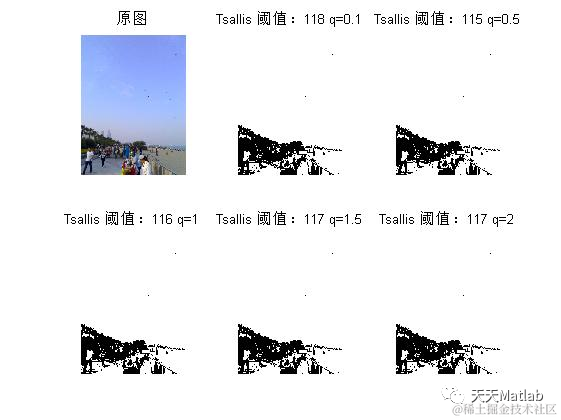 subplot(2,3,6);imshow(I3);title(['Tsallis 阈值:',num2str(t(1)),' q=',num2str(q(1))]);
