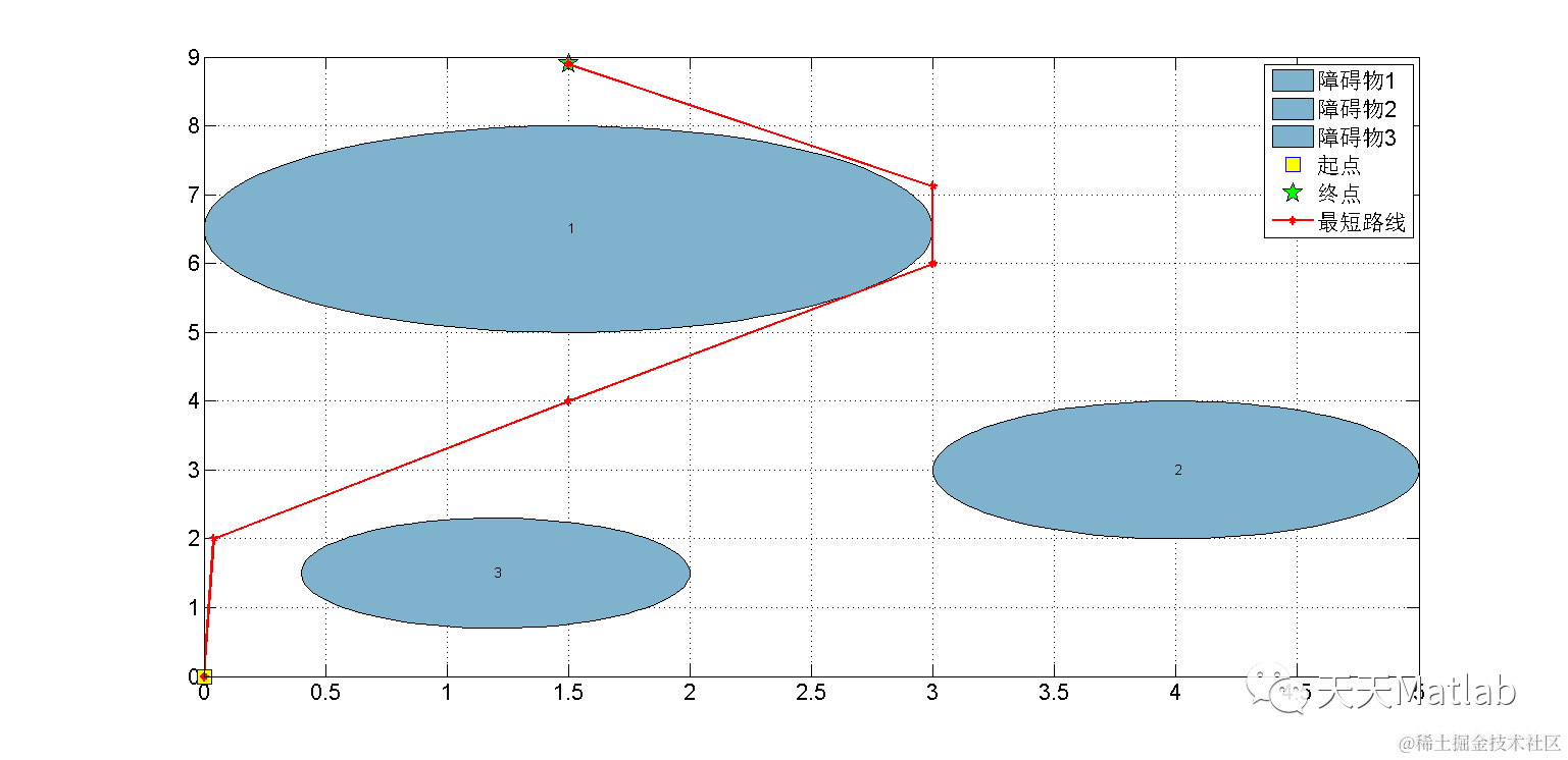 legend('障碍物1','障碍物2','障碍物3','起点', '终点', '最短路线')