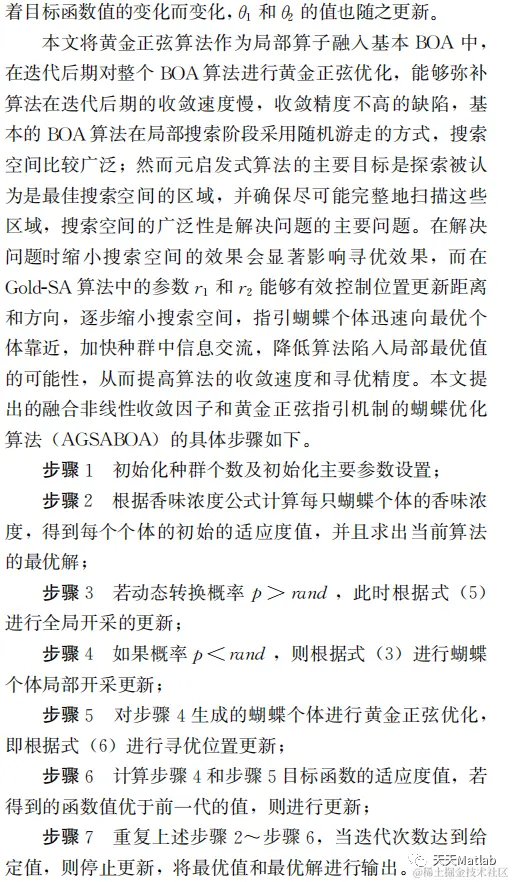 针对蝴蝶优化算法(butterfly optimization algorithm,BOA)中存在的局部开采和全局探索能力不均衡,易陷入局部最优值,收敛精度低等缺陷,提出收敛因子和黄金正弦指引机制的蝴蝶优化算法(convergence factor and gold sinusoidal guidance mechanism of butterfly optimization algorithm,AGSABOA).受到鲸鱼优化算法的启发将收敛因子融入算法的全局位置更新处,提高算法全局搜索的多样性;结合黄金正弦指引机制,弥补BOA算法迭代后期种群多样性下降,易陷入局部最优的不足.选取9个常用的基准测试函数进行的仿真结果表明,AGSABOA算法在寻优精度,收敛速度,鲁棒性方面更优.