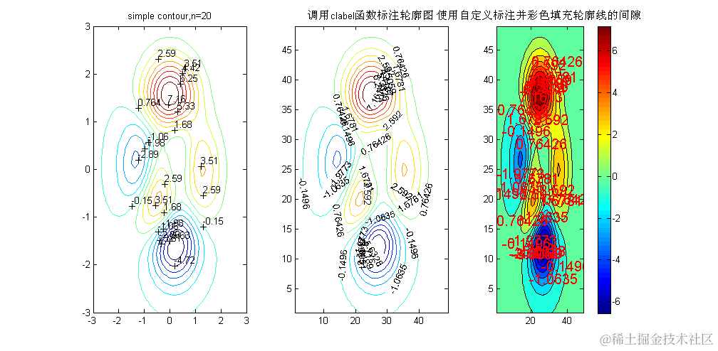 | 123456789101112131415161718192021222324 | %% ==========轮廓线图的绘制==========``%clabel-利用轮廓矩阵生成标签并在当前图形中显示``%contour-利用矩阵所给的值生成二维轮廓线``%contour3-利用矩阵所给的值生成三维轮廓线``%contourf-显示二维轮廓图并用色彩填充个轮廓线的间隙``%contourc-计算被其他轮廓函数占用的轮廓矩阵的低层函数``[x,y,z]=peaks;``n=``15``;% 等高线分级数``figure;``subplot(``1``,``3``,``1``);``h=contour(x,y,z,n);%绘制``20``条等高线``clabel(h);%当前图形中显示标签,标签前有``'+'``号且标签会根据轮廓线旋转,每条轮廓线仅有一个标签``title(``'simple contour,n=20'``);``subplot(``1``,``3``,``2``);``z=peaks;``[c,h]=contour(z,n);%绘制``15``条等高线``clabel(c,h);%标签前无``'+'``号,每天轮廓线可能有多个标签``title(``'调用clabel函数标注轮廓图'``)``subplot(``1``,``3``,``3``);``z=peaks;``[c,h]=contourf(z,n);``clabel(c,h,``'FontSize'``,``15``,``'Color'``,``'r'``,``'Rotation'``,``0``);%自定义标签``colorbar;``title(``'使用自定义标注并彩色填充轮廓线的间隙'``); |