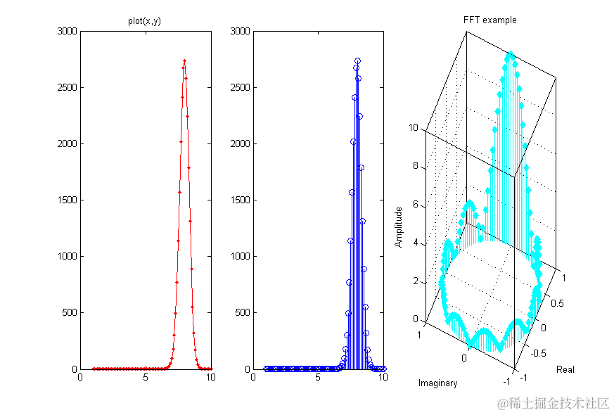 | 123456789101112131415161718192021222324252627 | %% =======绘制离散数据杆状图===========``%stem和stem3函数用于绘制二维或三维的离散数据杆状图``%stem(Y)可以理解成绘制离散点的plot(y)函数``%stem(X,Y)可以理解成绘制离散点的plot(x,y)函数``%stem(...,``'filled'``)改变数据点显示的空、实状态。``%stem(...,``'LINESPEC'``)Linespec代表直线属性设置参量。``x=``1``:.``1``:``10``;``y=exp(x.*sin(x));``figure;``subplot(``1``,``3``,``1``);``plot(x,y,``'.-r'``);``title(``'plot(x,y)'``);``subplot(``1``,``3``,``2``);``stem(x,y,``'b'``);``subplot(``1``,``3``,``3``);``stem(x,y,``':g'``,``'fill'``);``%绘制三维离散杆状图``th=(``0``:``127``)/``128``*``2``*pi;% 角度采样点``x=cos(th);``y=sin(th);``f=abs(fft(ones(``10``,``1``),``128``)); %对离散方波进行 FFT 变换,并取幅值``stem3(x,y,f``','``cd``','``fill');%绘制图形``view([-``65 30``]);``xlabel(``'Real'``); %图形标注``ylabel(``'Imaginary'``);``zlabel(``'Amplitude'``);``title(``'FFT example'``); |