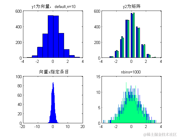 | 1234567891011121314151617181920 | %% 绘制统计直方图``%hist(y):如果y是向量,则把其中元素放入``10``个条目中,且返回每条中的元素的个数;如果y为矩阵,则分别对每列进行处理,显示多组条形。``%[n,xout]=hist(y,x):非递减向量x的指定bin的中心。向量xout包含频率计数与条目的位置。``x=-``10``:.``1``:``10``;``y1=randn(``2008``,``1``);``y2=randn(``2008``,``3``);``figure;``colormap(winter);``subplot(``2``,``2``,``1``);``hist(y1);%把其中元素放入``10``个条目中``title(``'y1为向量,default,n=10'``);``subplot(``2``,``2``,``2``);``hist(y2);%分别对每列进行处理,显示多组条形``title(``'y2为矩阵'``);``subplot(``2``,``2``,``3``);``hist(y1,x);%用户也可以使用[n,xout]=hist(y1,x);bar(xout,n)绘制条形直方图``title(``'向量x指定条目'``);``subplot(``2``,``2``,``4``);``hist(y2,``1000``);%第二个参数为标量时指定bin的数目``title(``'nbins=1000'``); |