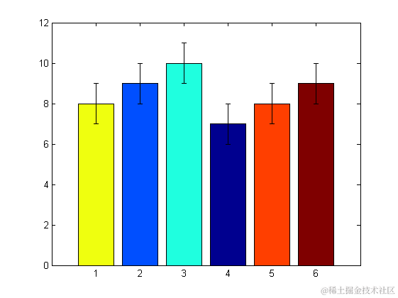 | 123456789 | %% ========均值方差直方图========``a=[``8 9 10 7 8 9``];%mean``b=[``1 1 1 1 1 1``];%std``figure();``h=bar(a);``ch=get(h,``'children'``);``set(ch,``'FaceVertexCData'``,[``4``;``2``;``3``;``1``;``5``;``6``]);%使用Indexed形式指定每组bar的颜色``hold on;``errorbar(a,b,``'k'``,``'LineStyle'``,``'none'``); |