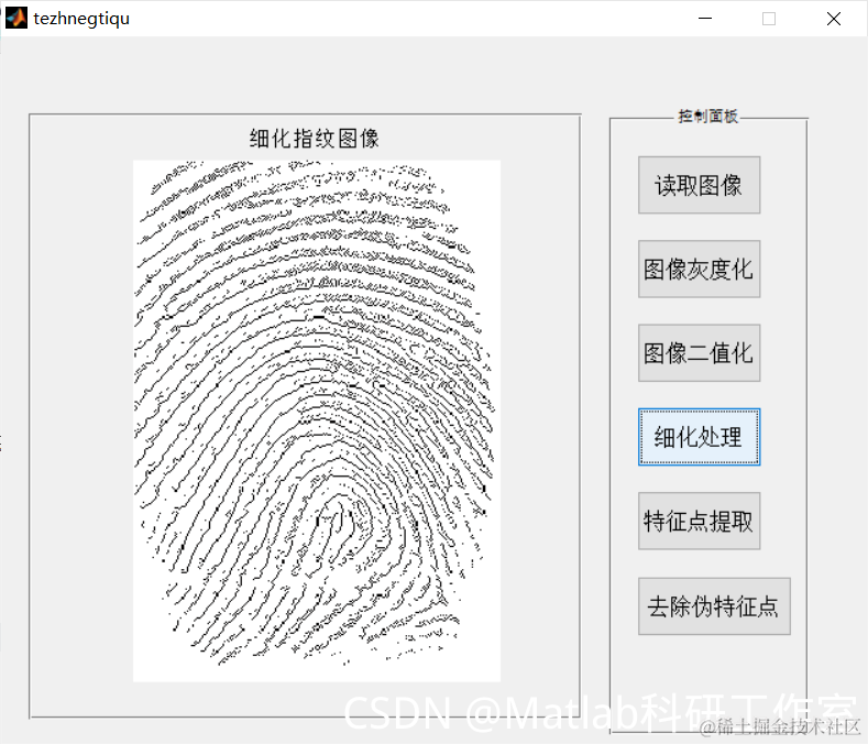 subplot(2,2,2);imshow(I);title('细化指纹图像');%显示细化后指纹