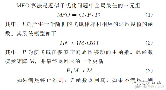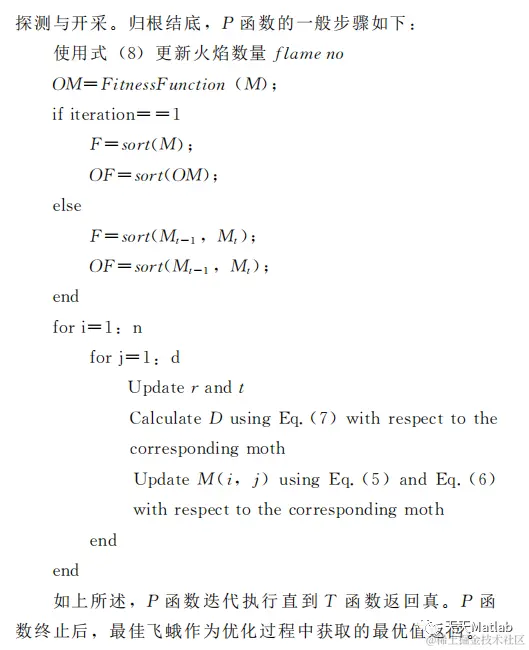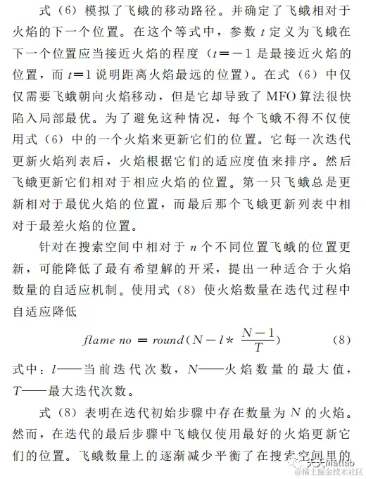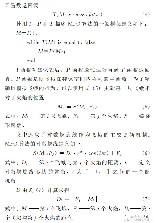 在基本 MFO 算 法 中,假设飞蛾是候选解,矩 阵 M 表示飞蛾的集合,数组OM 用于存储相应的适应度值。该 算法的另外一个核心组件是火焰,火 焰 矩 阵 用 F 表 示,且 数组 M 和F 的 维 数 相 等,数 组 OF 用来存储相应的适应度值。在这里,飞蛾和火焰都是解。它 们 之 间 不 同 之 处 就 是在每一次迭代过程中对待和更新它们的方式不同。飞 蛾 是在搜索空间里移动的实际搜索主体,而火焰是飞蛾到目前为止获取的 最 佳 位 置。因 此,倘 若 找 到 一 个 更 好 的 解,每只飞蛾便在标记附近搜索并更新它。通 过 此 机 制,飞 蛾 永远不会错过它的最优解。