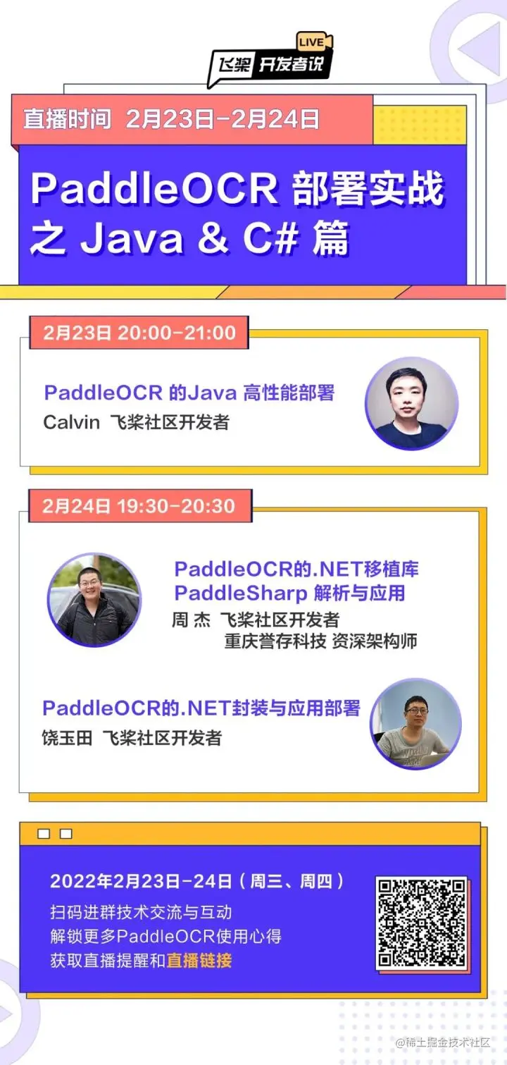 其中,在桌面场景下,Inference离线预测是最受欢迎的方案之一,Inference推理有多种语言的实现,本周三、周四晚上(2月23日-24日) ,将有3位飞桨社区开发者为我们详细分享PaddleOCR在Java和C#的部署方案,欢迎大家加入技术交流群,获取直播链接~