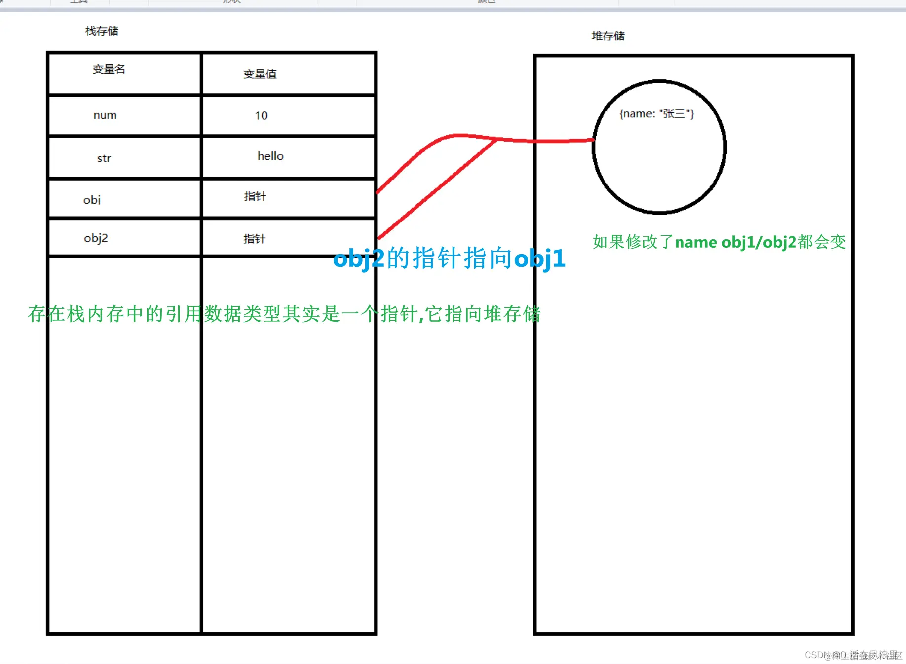 一个对象赋值一个变量,变量将对象的值更改了,赋值的对象也会跟随变动,其实赋值的是指针,指针相同,共同指向堆内存中开辟的空间,所以obj2更改name,obj1的name也变动了