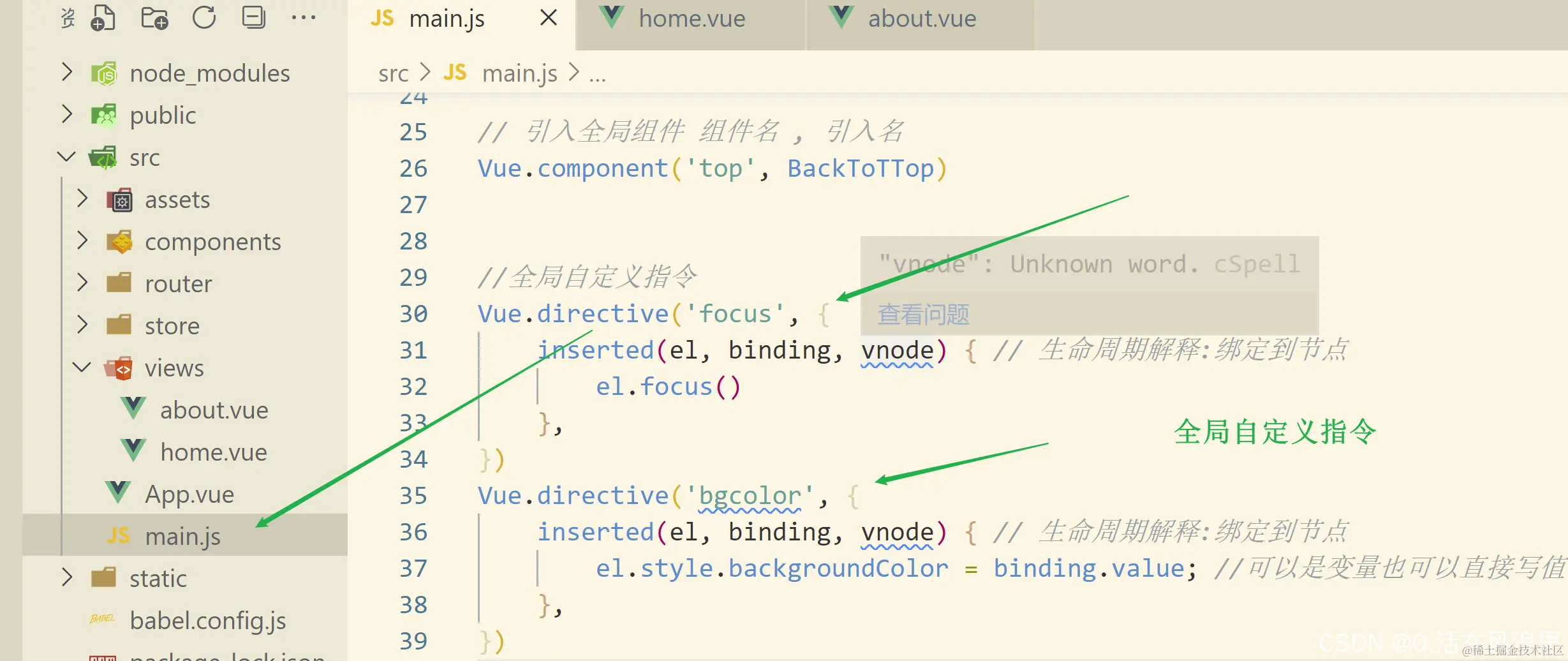 全局自定义指令最简单的写法实在main.js直接书写全局自定义指令是通过Vue.directive('第一个参数是指令的名称,第二个是对象,对象里面有钩子函数,钩子函数分别有