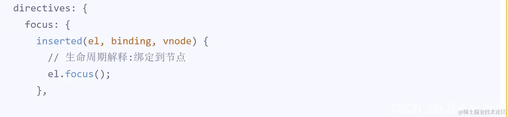 钩子函数的形参有el,vnode,binding,el是绑定的元素、vnode虚拟dom,binding是被赋值的结果,要用binding.value来接收调用指令时赋的值,对象里操作逻辑