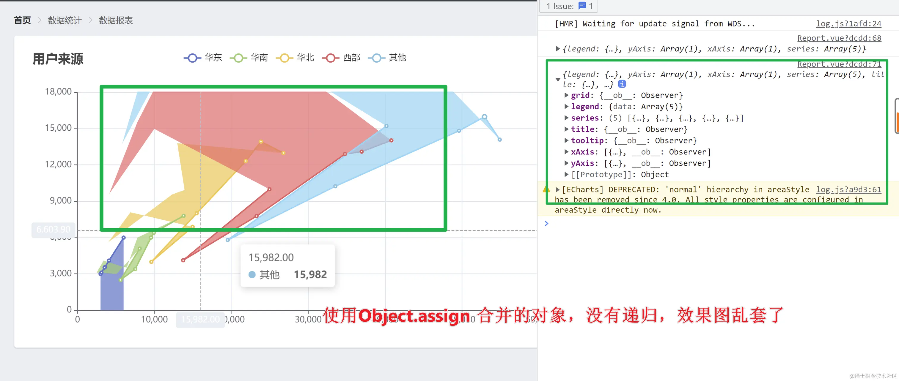 在看手动合并的对象形式:效果图乱套了,原因是Object.assign()只是单纯的合并没有递归,渲染时找不到准确的数据