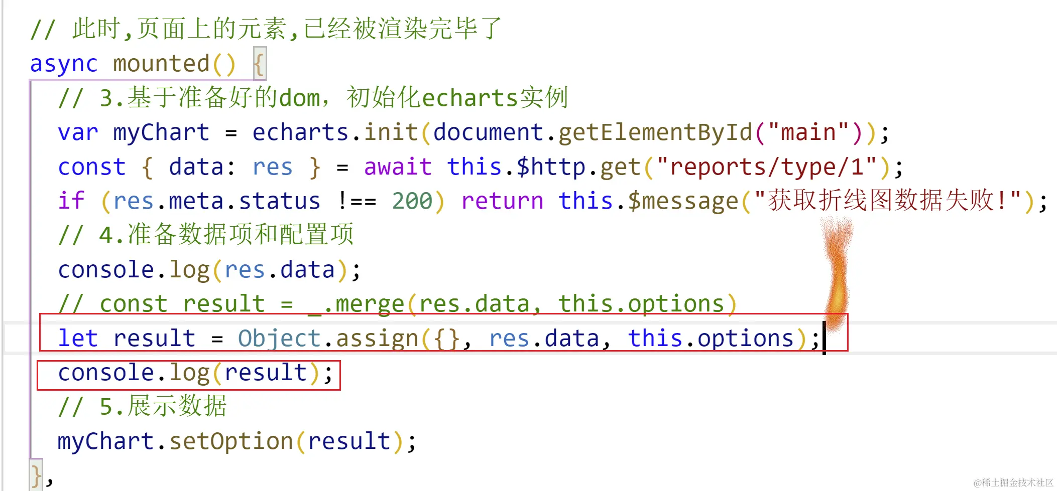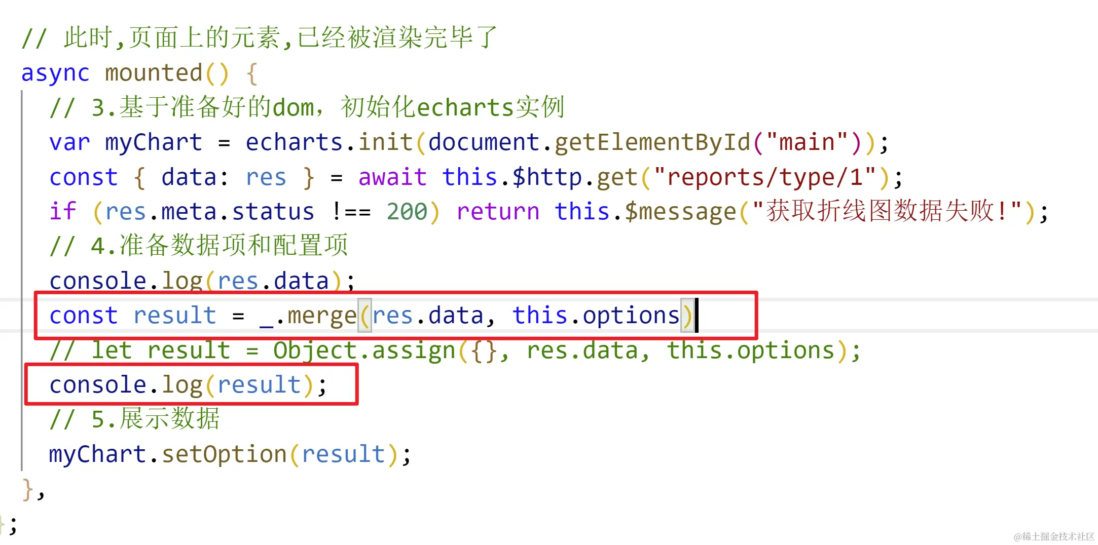 所以我们借助lodash来完成合并,自己手动合并也可以要递归,直接使用扩展运算符和Object.assign不可以,思路:先将后台的数据定义在data中,再将请求的数据与之合并,将合并后的变量传给setOption