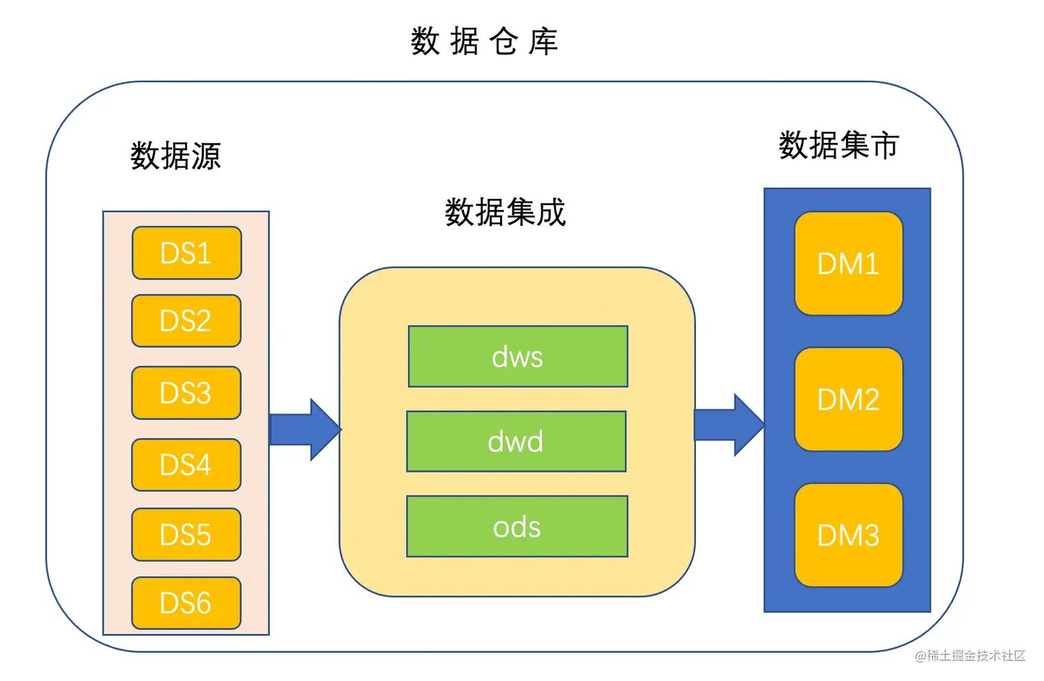 这里还有一点要强调数据集市是作为我们数仓的一层,对外提供数据服务,当然提供服务的方式是有很多种的,但是最终我们是将数据集市层的数据提供出去的,也就是说这一层是面向用户的。