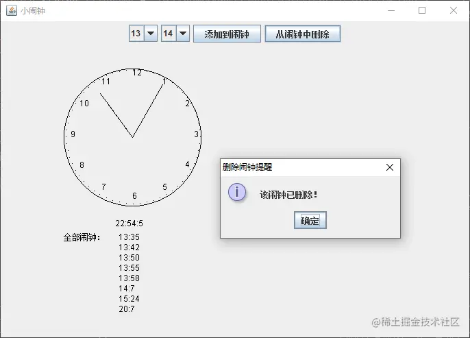 JOptionPane.showMessageDialog(null,"该闹钟已删除!","删除闹钟提醒",JOptionPane.INFORMATION_MESSAGE); //弹窗提示