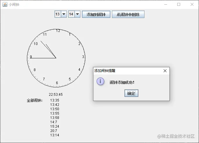 JOptionPane.showMessageDialog(null,"闹钟添加成功!","添加闹钟提醒",JOptionPane.INFORMATION_MESSAGE); //提示框:添加闹钟成功