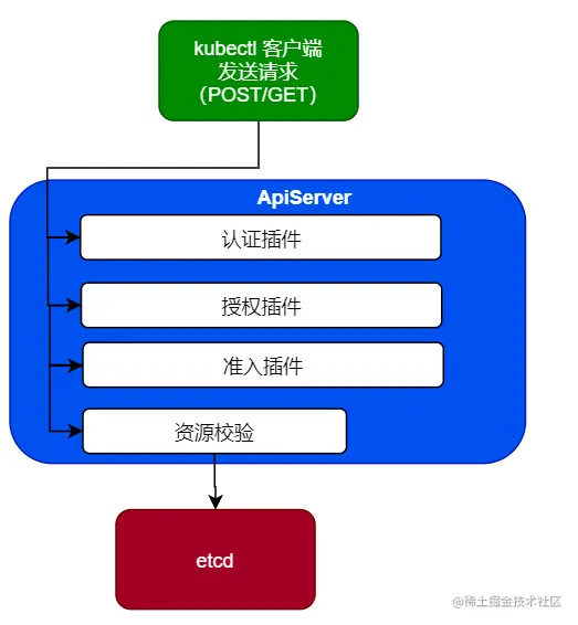 前面有说到 ApiServer 收到请求后,会去校验客户端是否有权限访问,ApiServer 会去自身的认证插件中进行处理认证,进而到授权插件中进行授权,例如这样的: