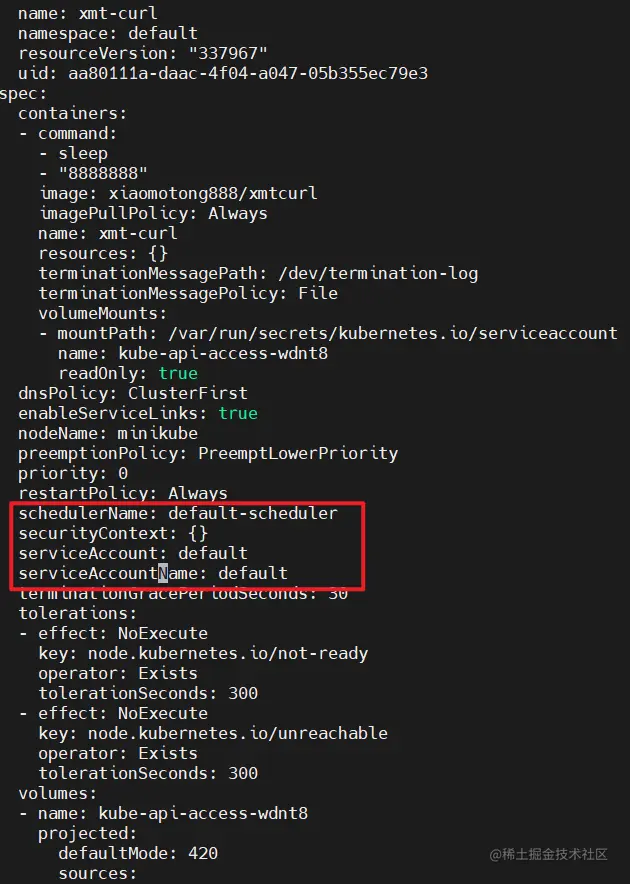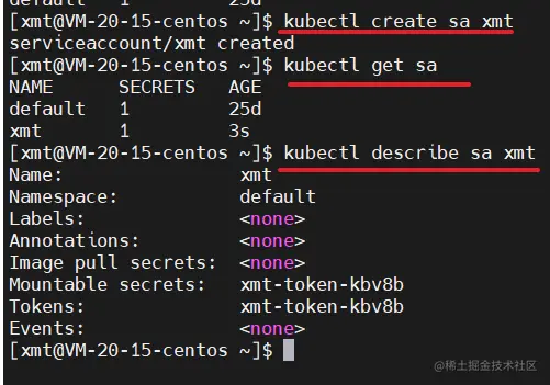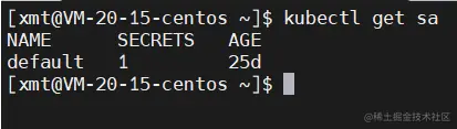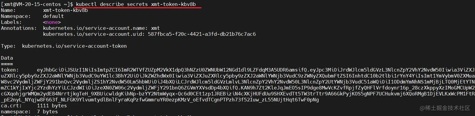 查看上述 xmt SA 的信息,k8s 默认给我们 xmt 账户生成了 token 和 secrets
