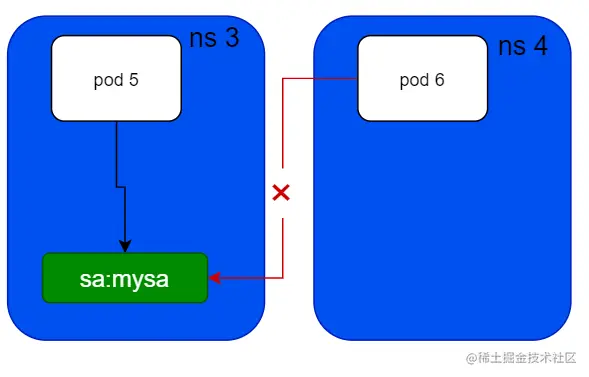 绝对不会存在 ns 4 的 pod ,会关联到 ns 3 的 ServiceAccount, 不在同一个命名空间,根本无法操作
