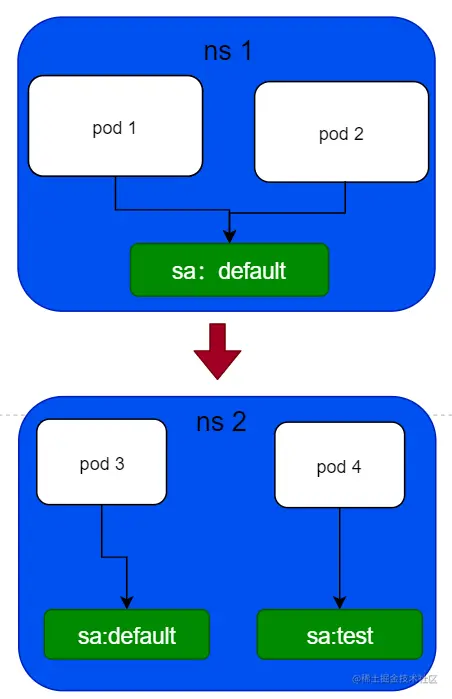 一个 pod 只会对应一个 SA,但是 一个 SA 是可以和多个 pod 关联的,并且,我们需要清楚,这些都是得再同一个命名空间下的,例如画一个简图来是表示一下