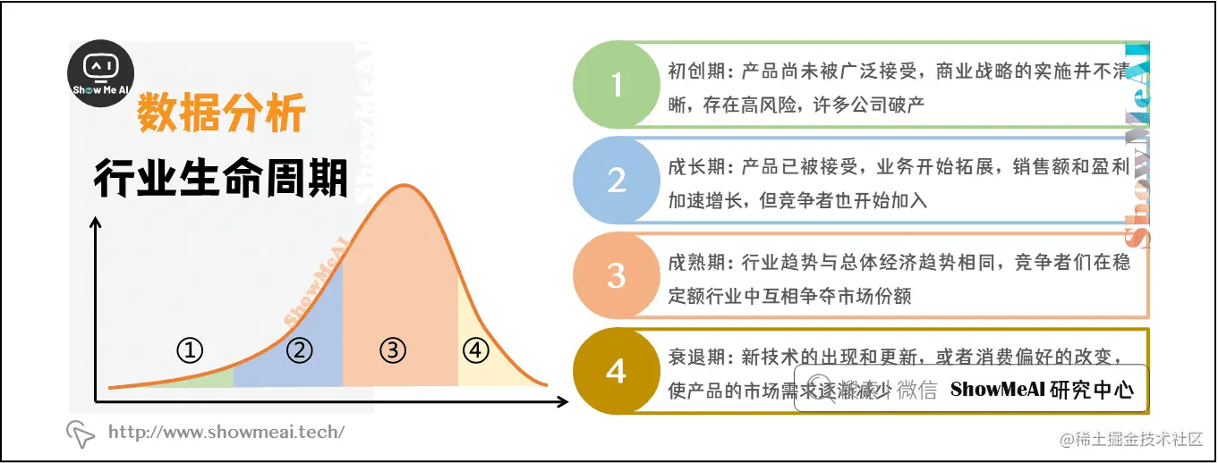 行业生命周期(Industry Life Cycle) ,指行业从出现到完全退出社会经济活动所经历的时间。行业的生命发展周期主要包括四个发展阶段:初创期,成长期,成熟期,衰退期。类似的分析思路也常用于用户生命周期的分析。
